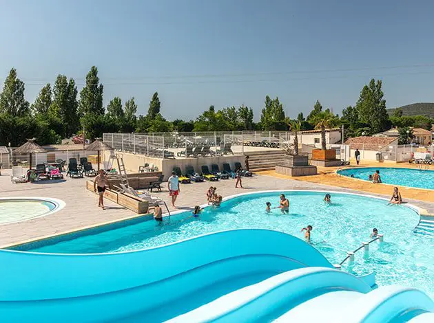 Ce camping offre un vaste espace aquatique avec plusieurs piscines chauffées et non chauffées, ainsi que des toboggans pour les plus jeunes, et des solariums pour la relaxation.
